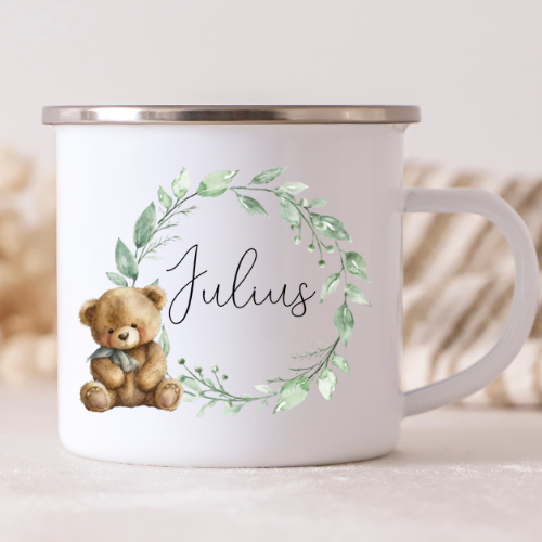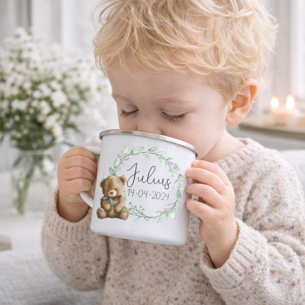 En charmerende kop med en sød bamseillustration og dit eget navn skaber den perfekte personlige gave.