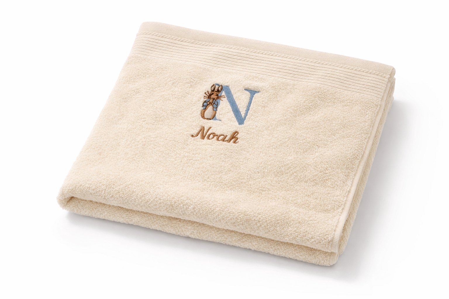 Vores bløde og økologiske håndklæde er smukt broderet med Peter Kanin og personliggjort med et broderet navn. Dette håndklæde tilbyder både komfort og charme i ét.