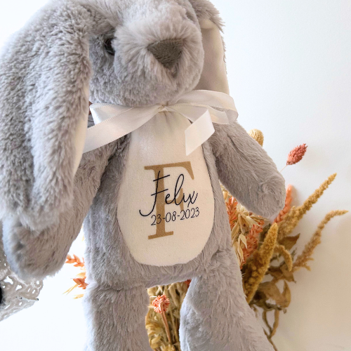 Vores super søde grå kaninbamse med navn er den perfekte gaveide til barnedåb, babyshower eller fødselsdag. Denne bløde og kærlige bamse vil bringe smil og glæde til enhver lille hjerte, og den personlige touch gør den endnu mere speciel." 🐰💕