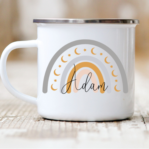 En charmerende kop med en sød regnbue og dit eget navn skaber den perfekte personlige gave.