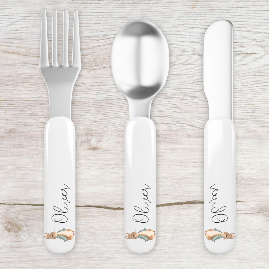 Gør måltiderne til en magisk oplevelse med et personligt bestiksæt fra My Little Nordic. Sød og personlig Peter kanin bestik med eget navn.