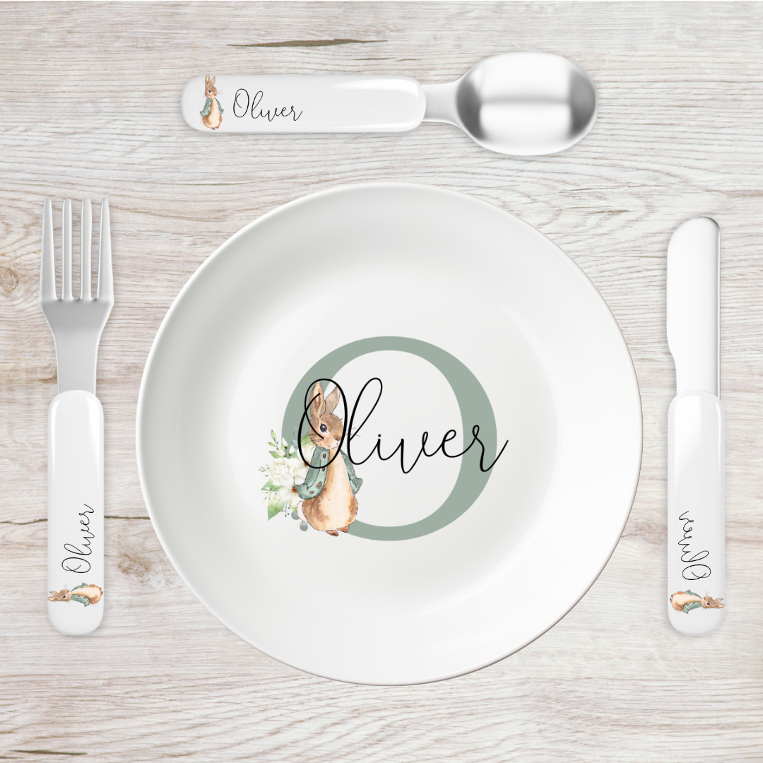 NYHED! Bestik sæt med navn / personligt bestik - Peter Kanin (Grønt bogstav)