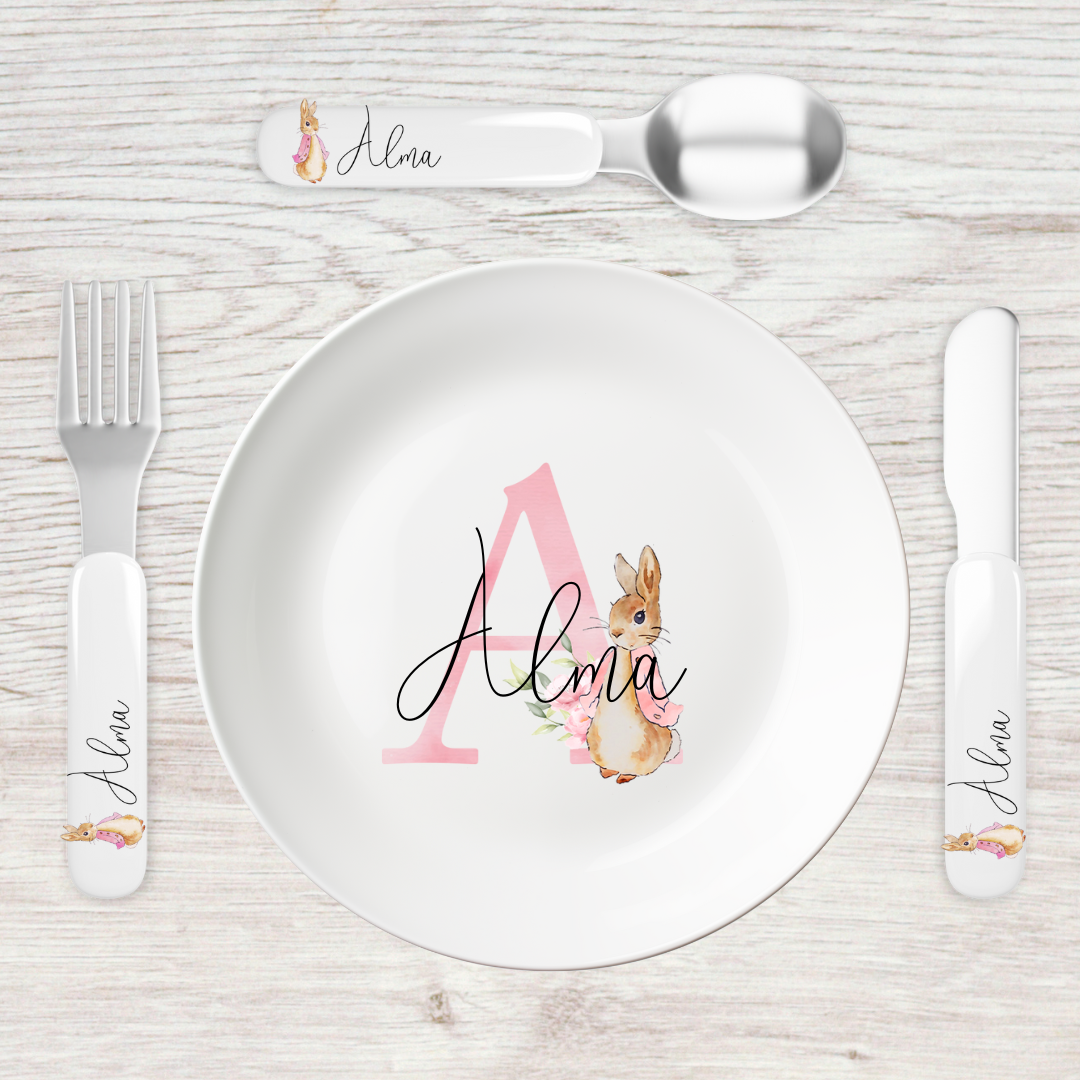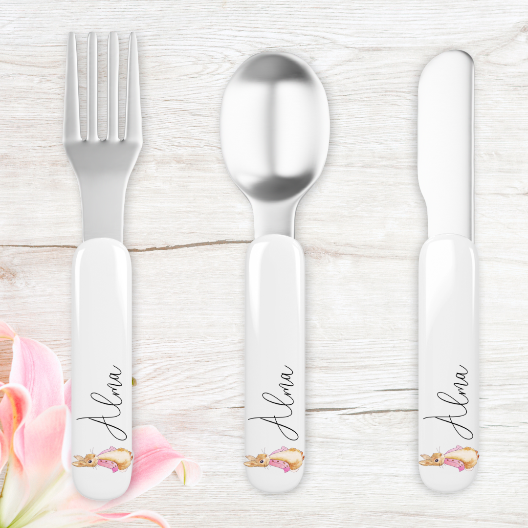 NYHED! Bestik sæt med navn / personligt bestik - Peter Kanin (Lyserødt bogstav)