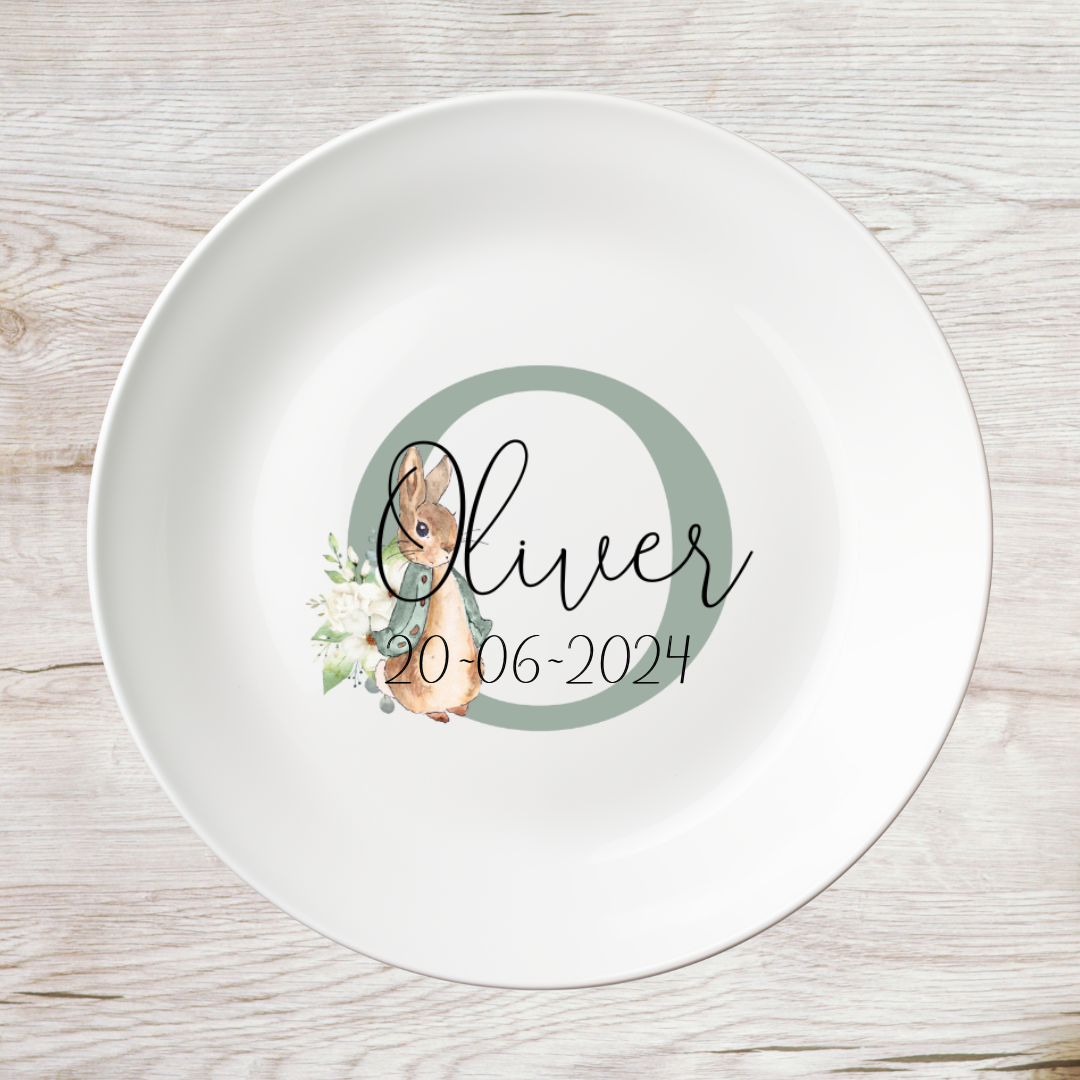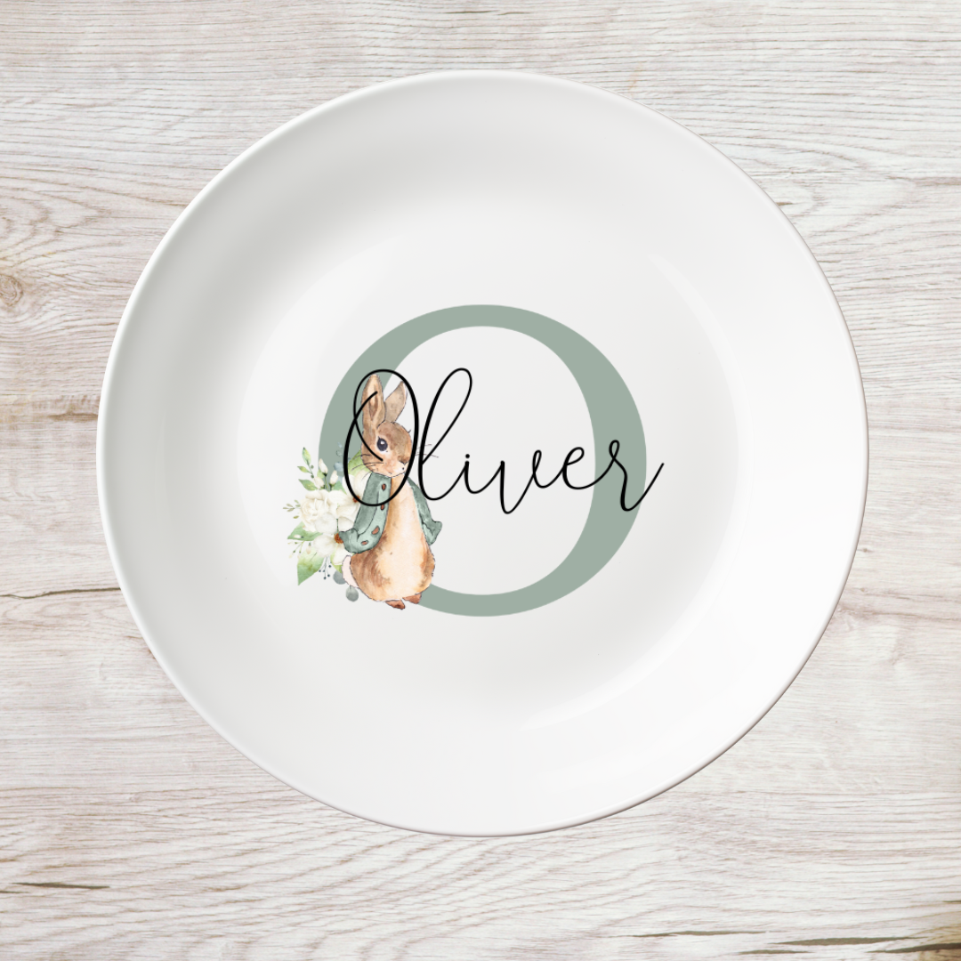 NYHED! Tallerken med navn / personlig tallerken - Peter Kanin (Grønt bogstav)