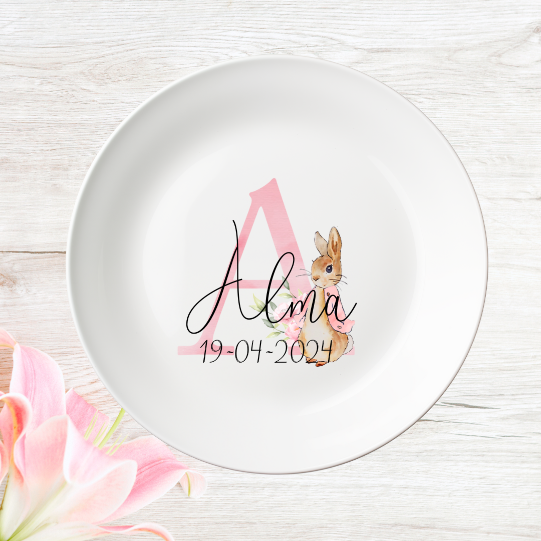 NYHED! Tallerken med navn / personlig tallerken - Peter Kanin (Lyserødt bogstav)