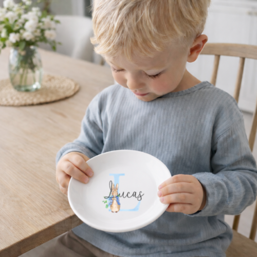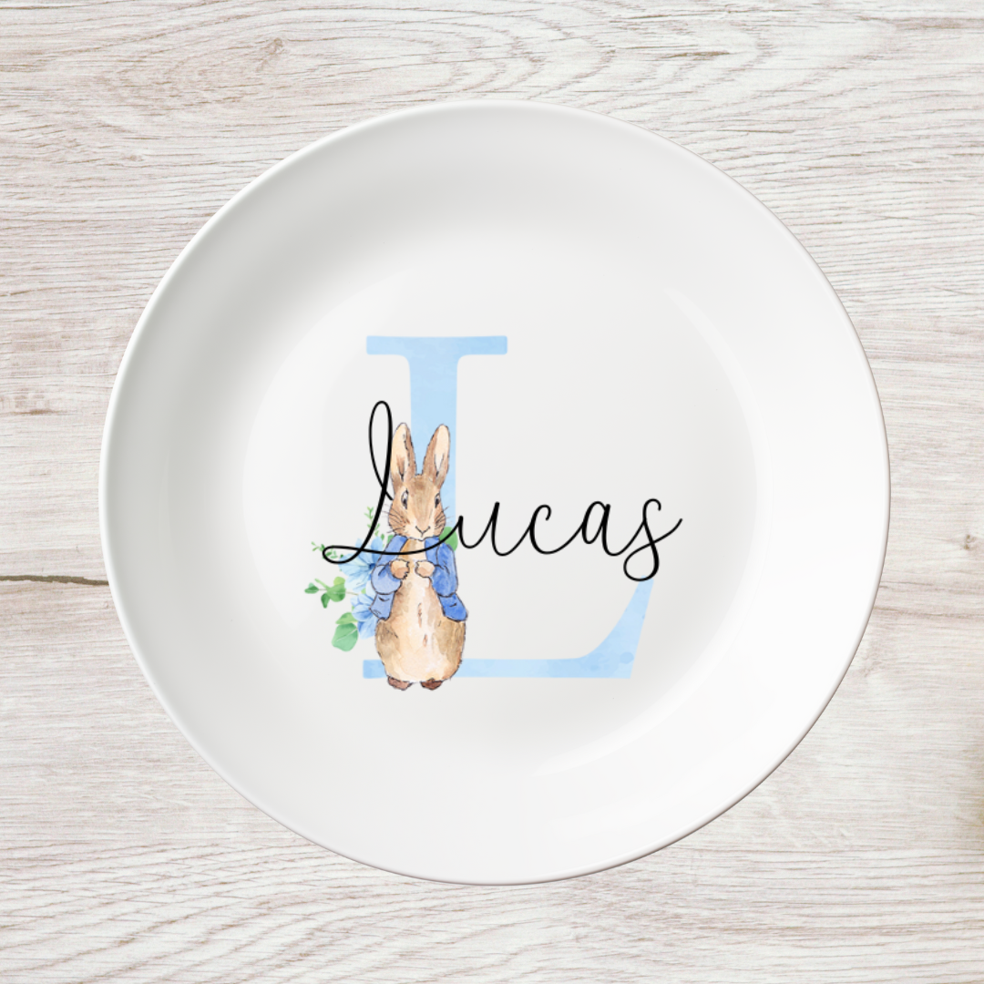 NYHED! Tallerken med navn / personlig tallerken - Peter Kanin (Blåt bogstav)